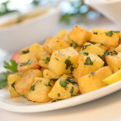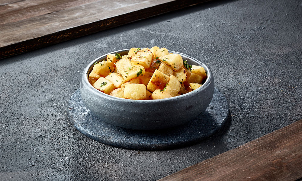 Fried potato cubes mixed with herbs, coriander, spices and virgin olive oil.