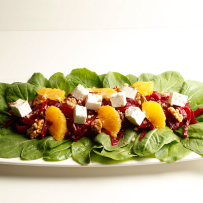 Rocca topped with beetroot, orange wedges, feta cheese and walnut.