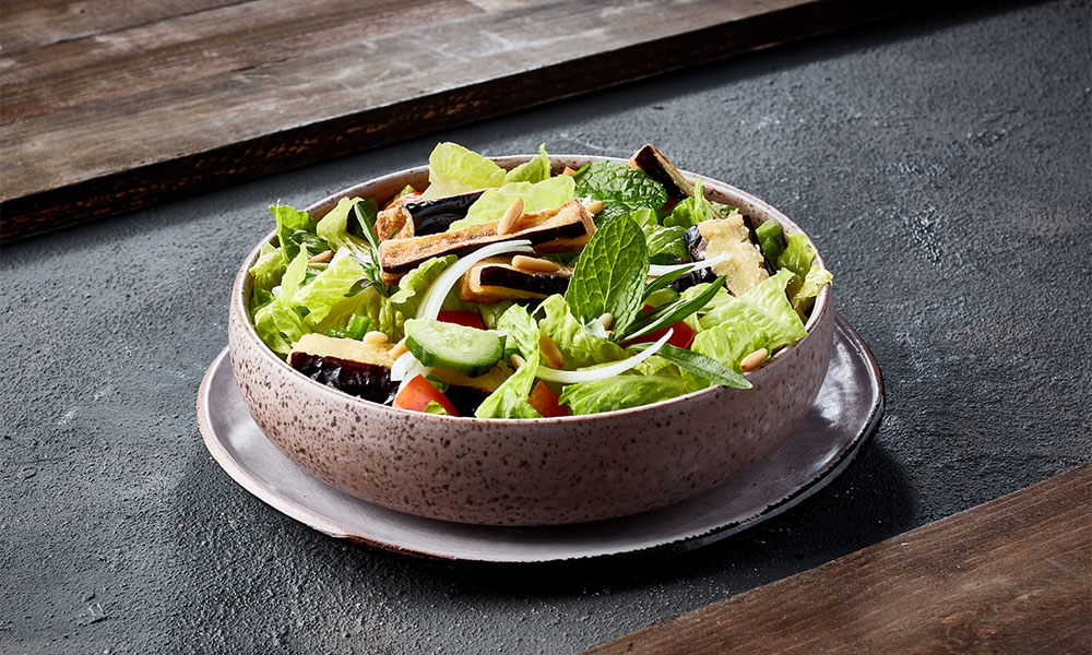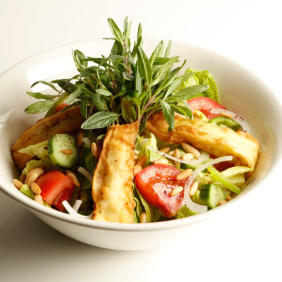 Vegan, light, lettuce, tomatoes, cucumbers, bell pepper, onions, freshly squeezed lemon juice and virgin olive oil, topped with fried eggplant and pine nuts.