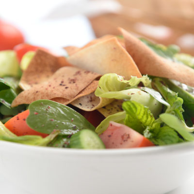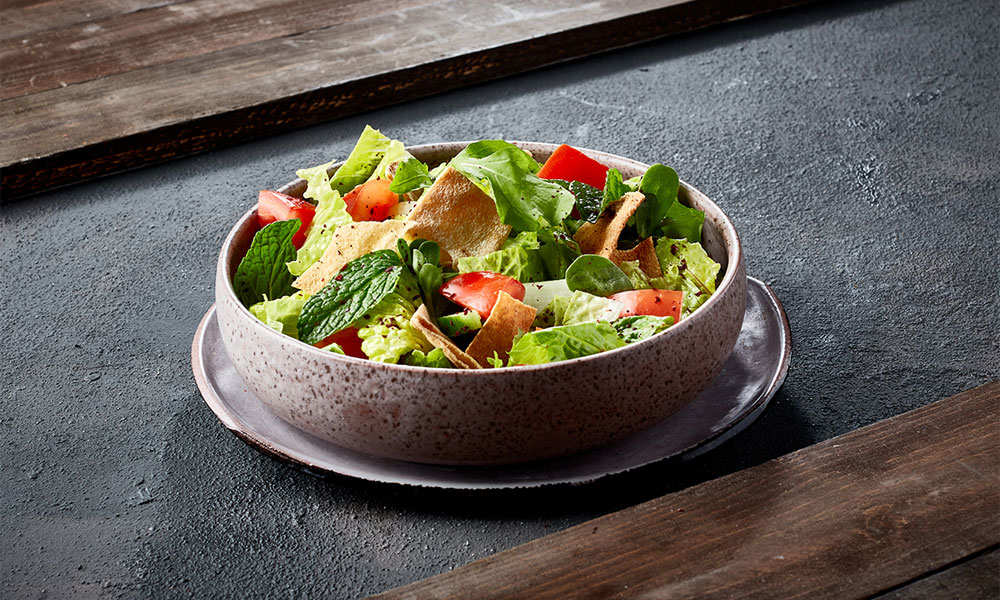 Rocca, lettuce, purslane, tomatoes, cucumbers, freshly squeezed lemon juice, virgin olive oil, hint of garlic and pomegranate syrup.