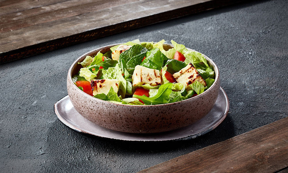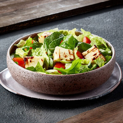 Medley of mixed greens, tomatoes, cucumbers, freshly squeezed lemon juice and virgin olive oil with grilled halloumi cubes