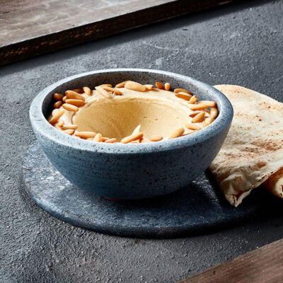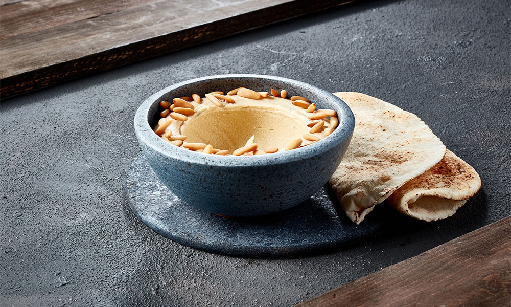 Blend of chickpeas, tahini, fresh lemon juice with pine nuts.