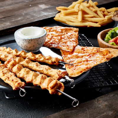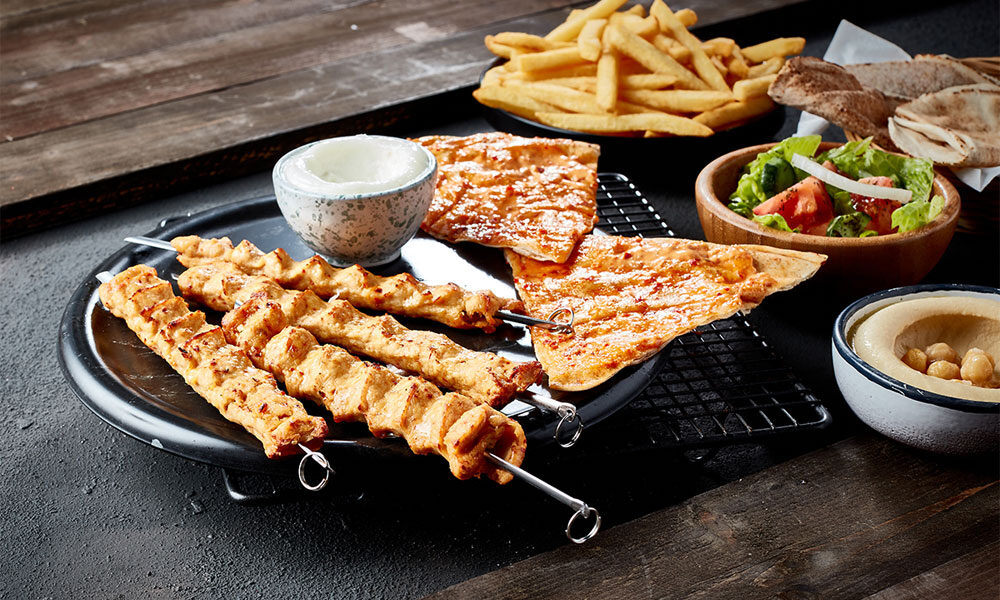 4 skewers of chicken kabab served with hommos, french french fries and a side salad