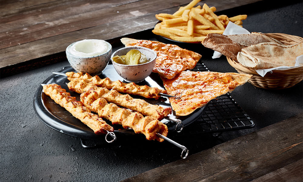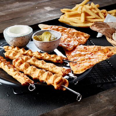 4 skewers of ground bonless chicken in a special blend of spices served with french fries