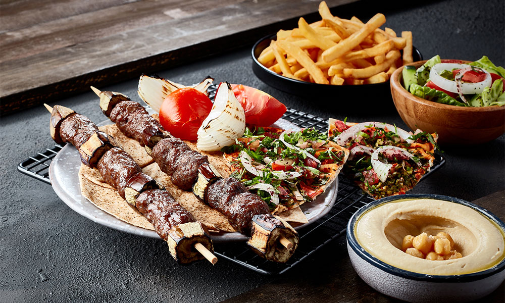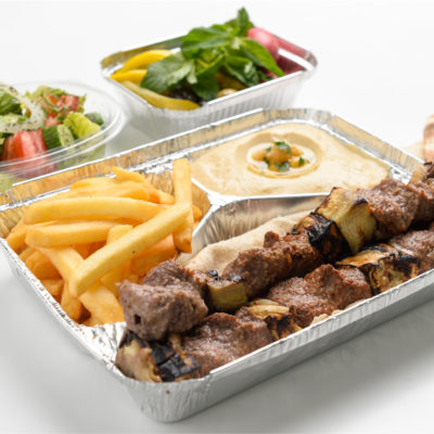 2 skewers of ground meat with grilled eggplant cubes served with hommos, french fries and a side salad