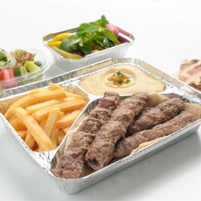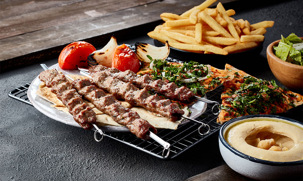 4 skewers of ground meat kneaded with house blend spices and parsley served with hommos, french fries and a side salad