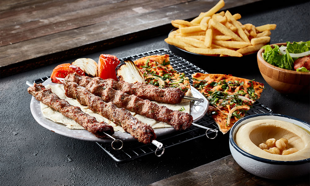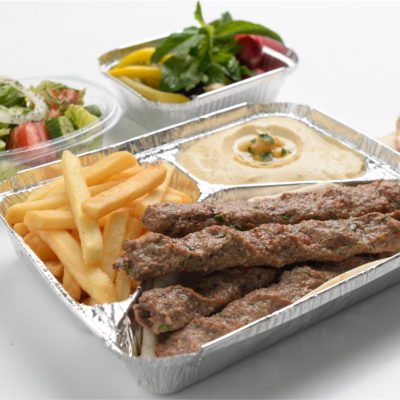 4 skewers of ground meat kneaded with house blend spices, green chili, parsley and hot pepper paste served with hommos, french fries and a side salad