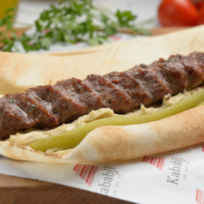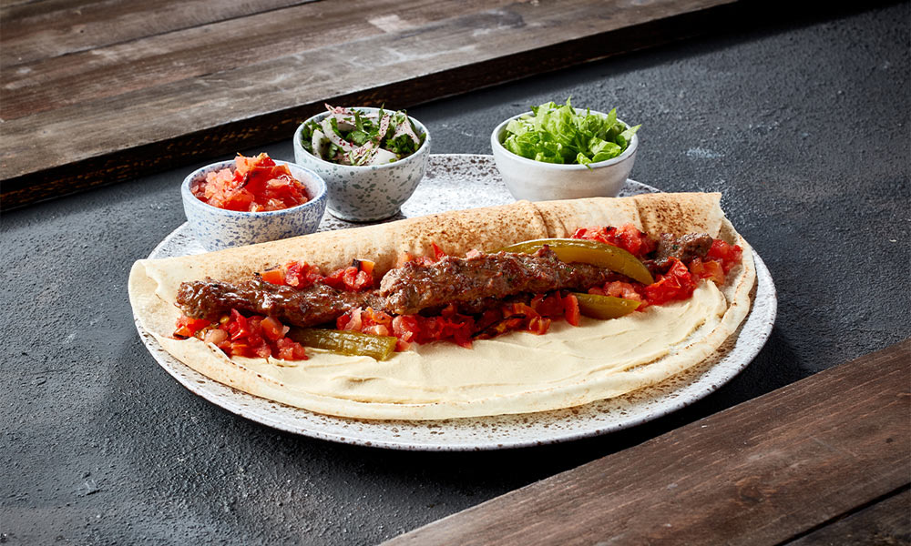 Ground meat kneaded with house blend spices and parsley, served over a bed of mashed tomatoes, hommos and pickles