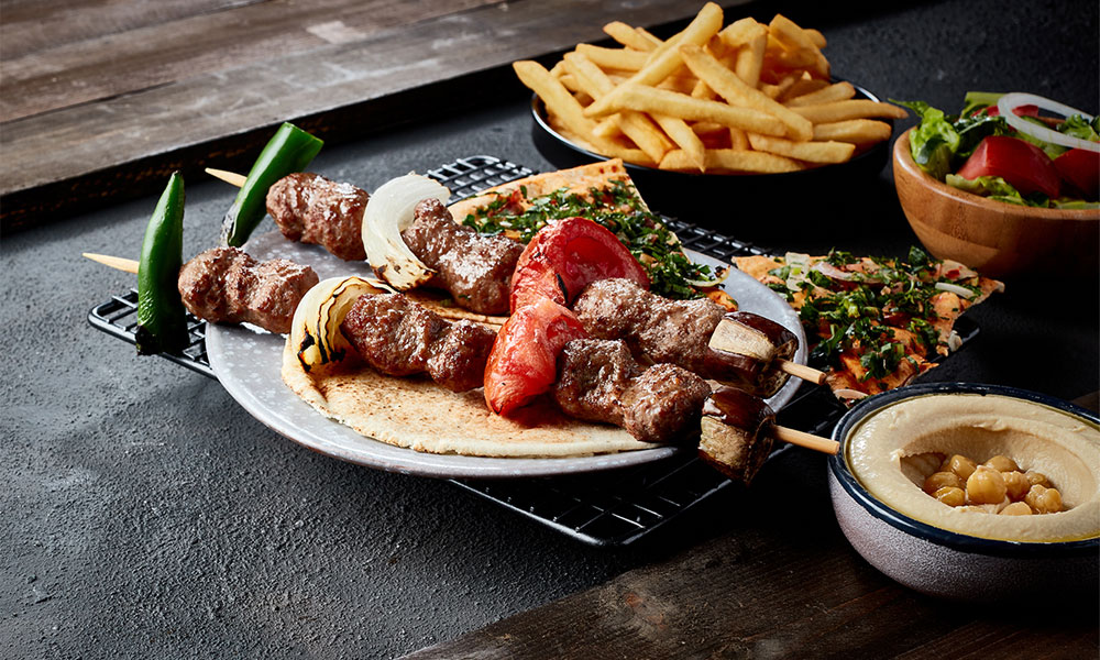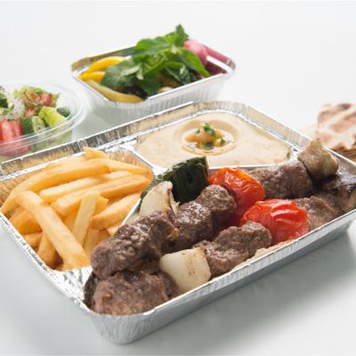 2 skewers of ground meat kneaded with grilled onions, tomatoes, eggplant and chili pepper served with hommos, french french fries and a side salad