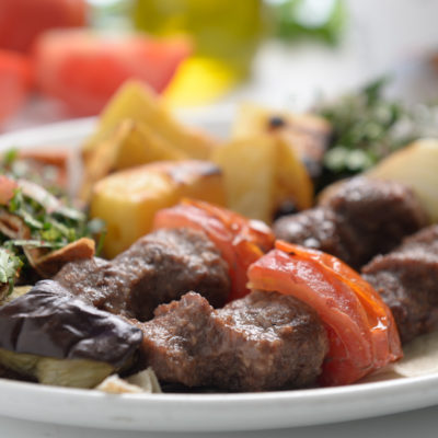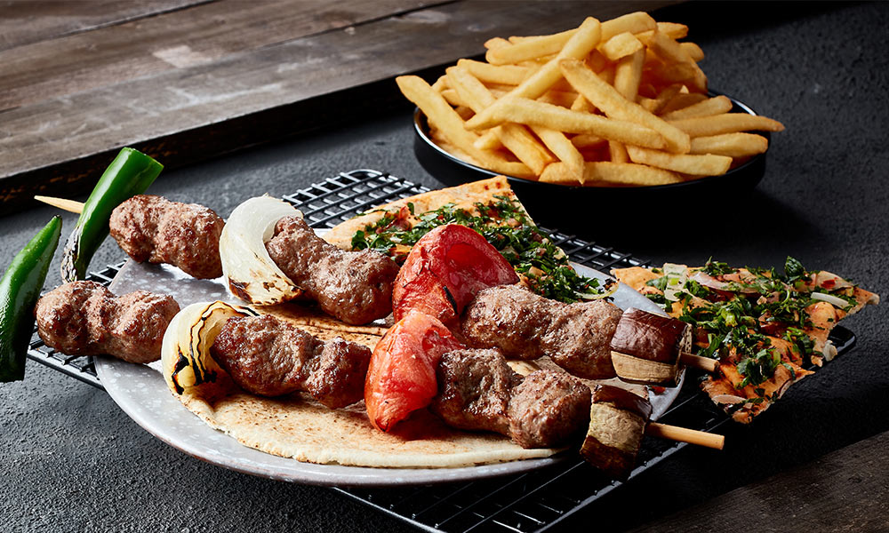2 skewers of ground meat served with grilled onions, tomatoes, eggplant, chili pepper and french fries