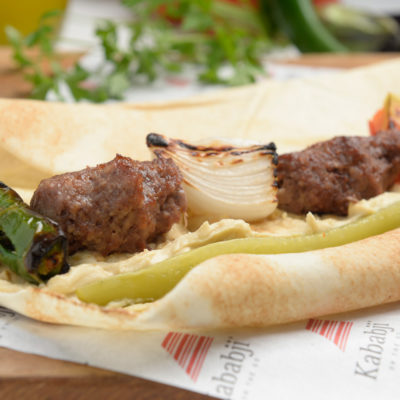 Ground meat served with grilled onions, tomatoes, eggplant, chili pepper, hommos and pickles