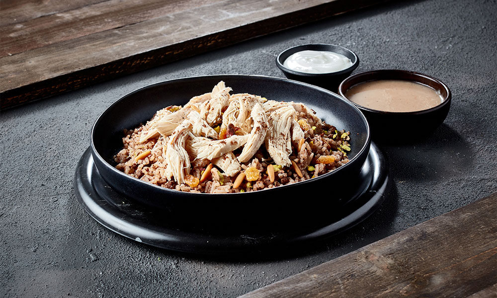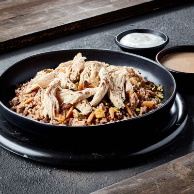 Oriental rice with meat topped with poached chicken and nuts served with chef’s special sauce