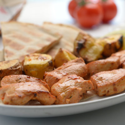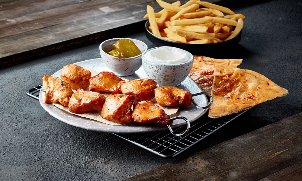 2 skewers of skinless boneless chicken breast cubes marinated in a special blend of spices served with french fries