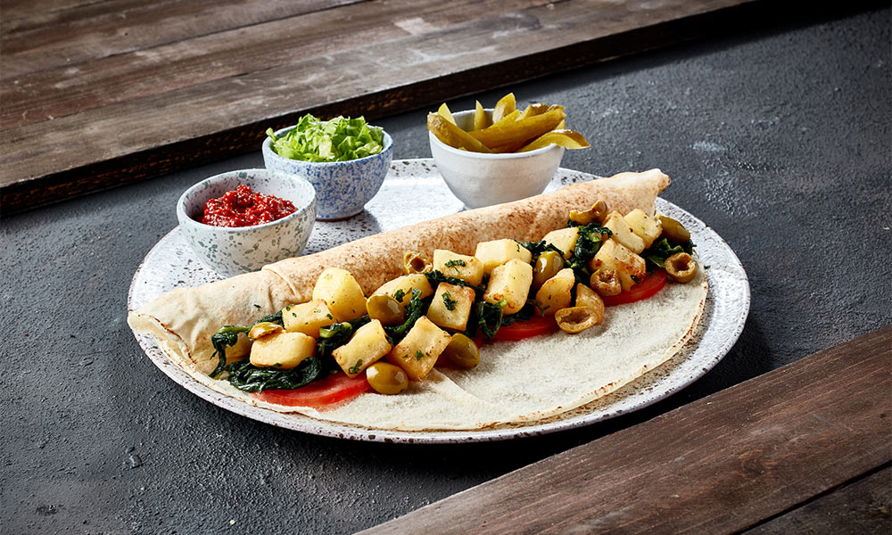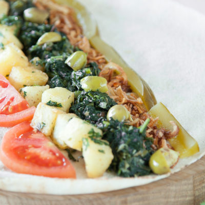 Potatoes, Coriander, hindbeh, olive, tomate & pickled cucumber.